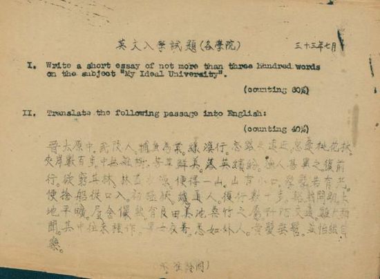 近日,有網友曬出了一組上海交通大學民國時期的考試題目,不少人表示自己真的“給民國學霸跪了”。比如1944年上海交通大學英文入學試卷:把文言文《桃花源記》翻譯成英文。先等等,《桃花源記》怎么背?