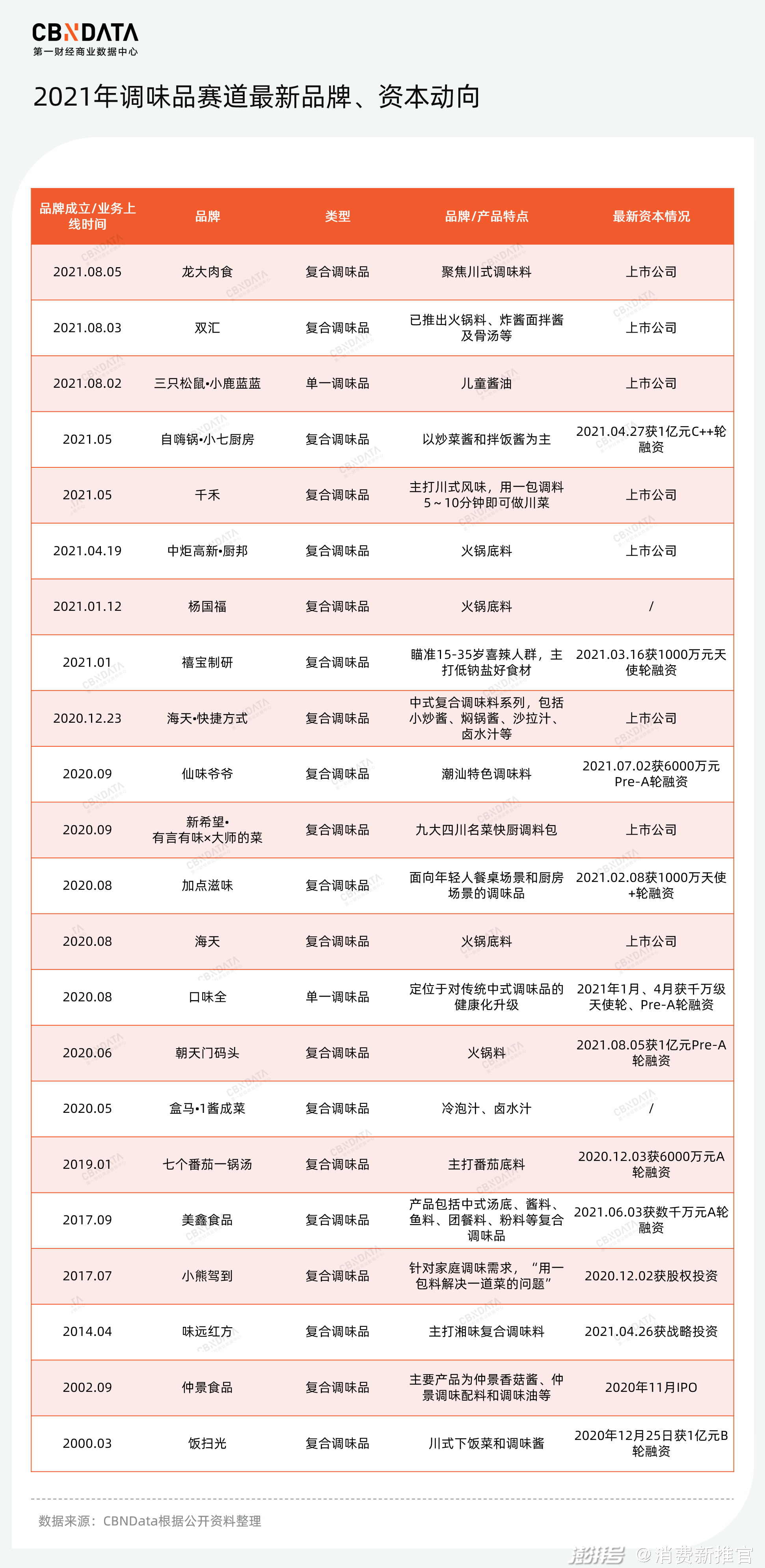 眼下,調(diào)味品市場(chǎng)“戰(zhàn)局”如何?CBNData消費(fèi)站圍繞新品牌/新業(yè)務(wù)上線、最新融資動(dòng)向兩大維度,梳理了眼下調(diào)味品賽道的最新動(dòng)向:
