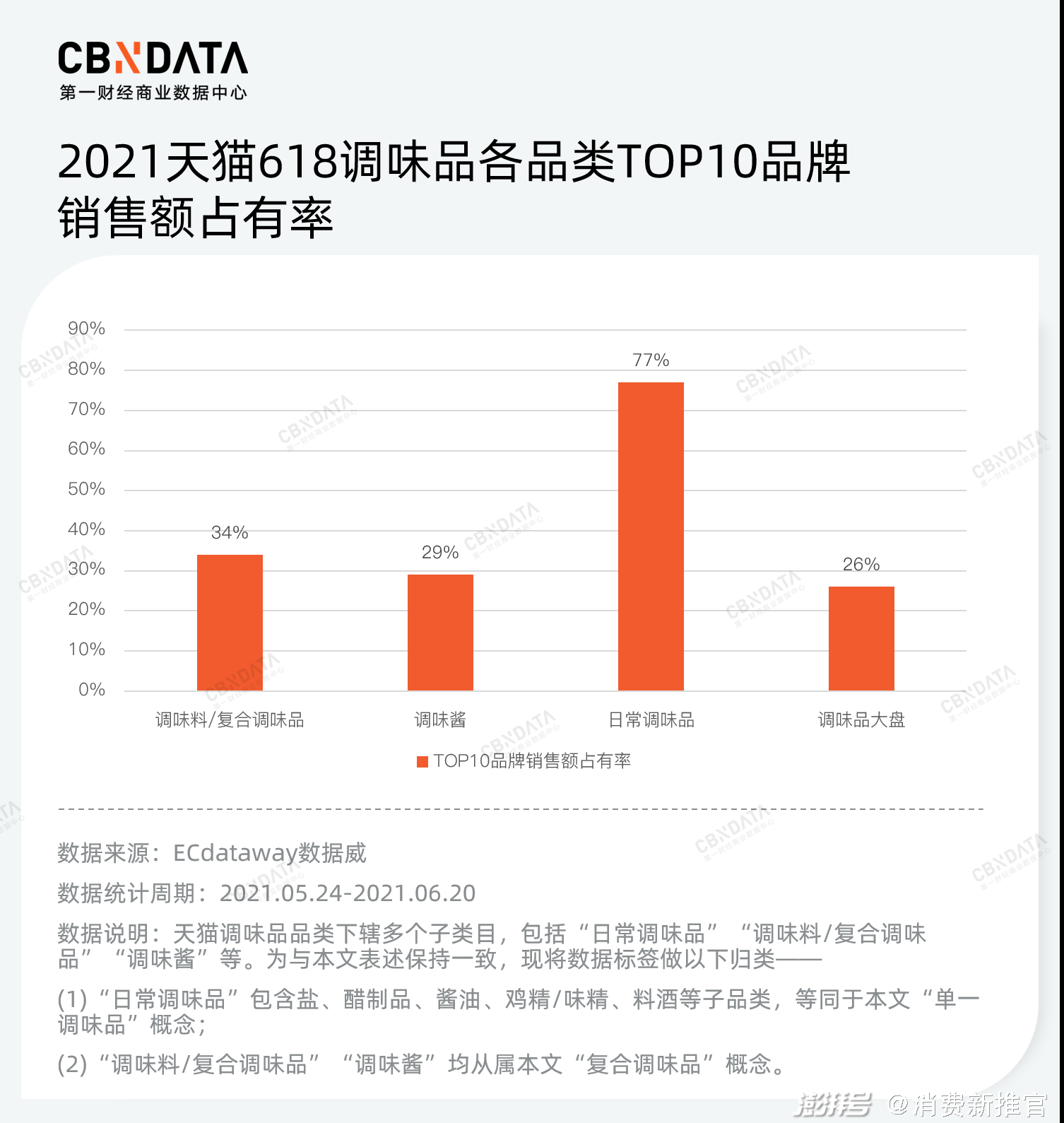 在單一調(diào)味品領(lǐng)域,頭部品牌的市占率很高,這也是該細(xì)分賽道新品牌入局較少的原因之一。以電商平臺(tái)的表現(xiàn)為例,ECdataway數(shù)據(jù)威數(shù)據(jù)顯示,2021年天貓618期間,調(diào)味品類(lèi)目銷(xiāo)售額TOP10品牌的銷(xiāo)售額占有率為26%。而日常調(diào)味品(包括鹽、醋制品、醬油、雞精/味精、料酒等單一調(diào)味品)TOP10品牌的占有率高達(dá)77%。這些品牌包括海天、千和、李錦記、廚邦等,不少都是上市企業(yè)。