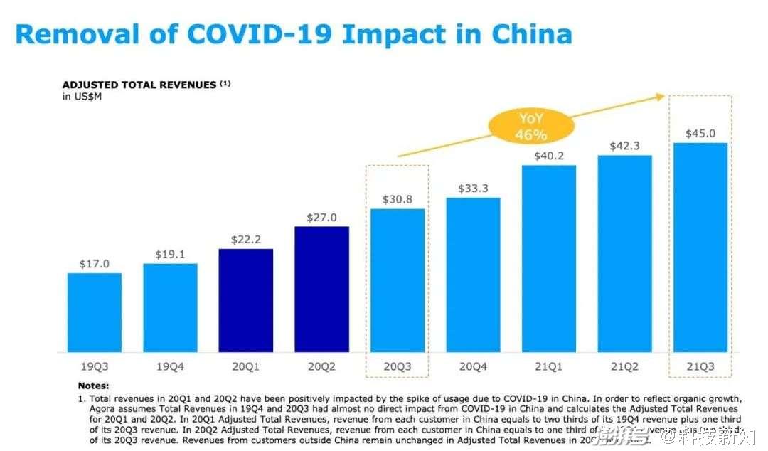 先關注營收層面,財報顯示,聲網Agora在2021年第三季度實現了4504萬美元的總營收,2020年同期為3080萬美元,同比增長46%。結合此前發布的財報,可以看到,在剔除2020上半年新冠肺炎疫情對全球的影響下,聲網營收連續實現十個季度增長。