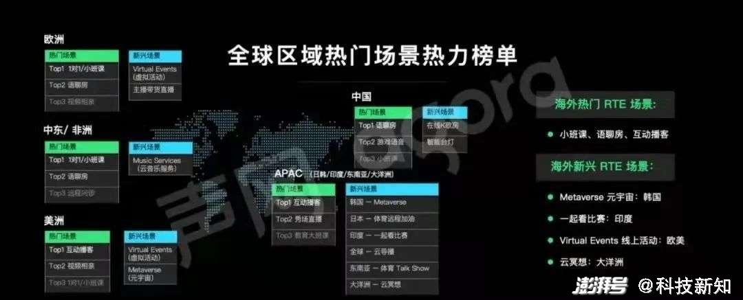 今年RTE大會上,在聲網發布的《全球區域熱門場景熱力榜單》中,1對1/小班課、語聊房、互動播客已成為全球TOP3的熱門場景,其中,互動播客已經成為亞太地區(包括日韓、印度、東南亞、大洋洲等)及美洲排名第一的熱門場景。