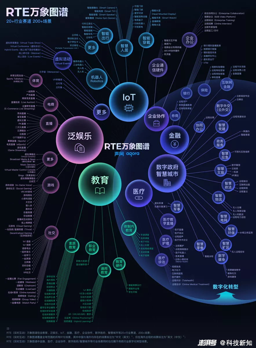 基于此,聲網在今年RTE大會上發布對行業和開發者做場景創新具有前瞻指引作用的“RTE萬象圖譜”,圖譜展示了圍繞泛娛樂、IoT、教育等二十多個行業賽道的二百多個實時互動場景。