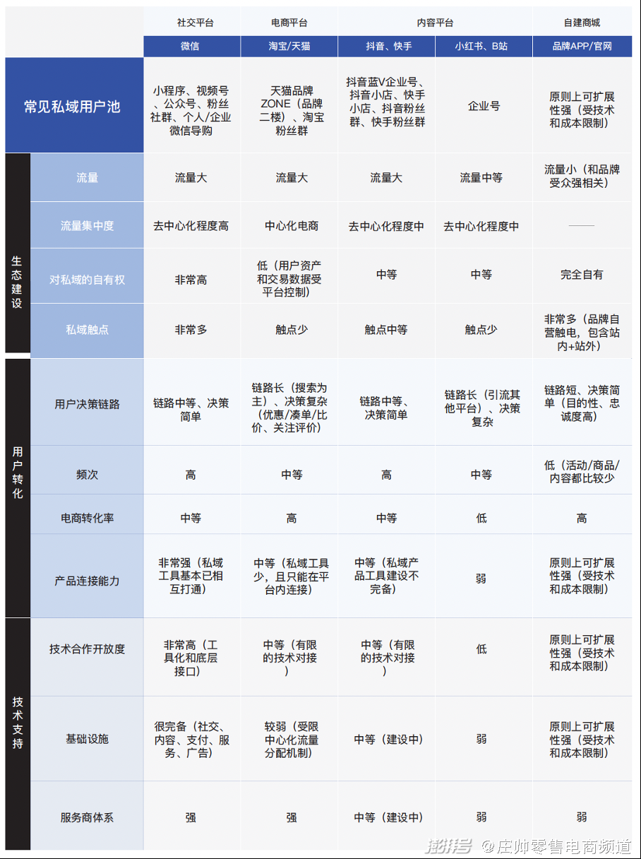 借由這個概念,各大電商平臺和內(nèi)容平臺也不約而同地推出了各種私域運營體系,這里也從三個維度簡單分析不同平臺的能力差異:
