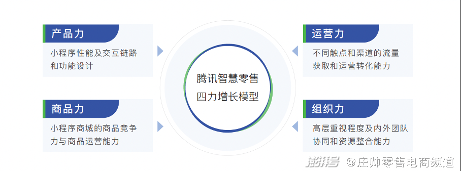 了解了全域經(jīng)營以品類為主導的三大運營模式之后,我們可以看到夯實私域?qū)τ谄髽I(yè)而言將會變得越來越重要,《中國零售業(yè)公私域運營手冊暨實施指引》中分享了騰訊智慧零售過去幾年實踐總結的一套系統(tǒng)的私域運營底層方法論——四力增長模型,從四項基礎能力——組織力、運營力、商品力、產(chǎn)品力,持續(xù)提升私域運營能力。