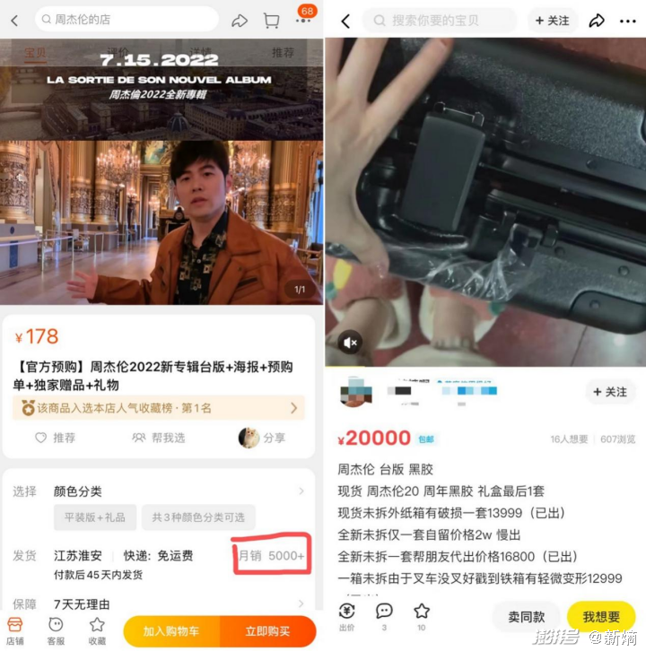 淘寶專輯代購店,上架了“官方臺版預(yù)購”的鏈接,定價在135—178元之間,排名靠前的一家店鋪,月銷已經(jīng)突破5000+,其他幾家店鋪也分別有2000+、1000+的銷量。同時熱銷的還有周杰倫CD+DVD全套專輯,包括單張價格已經(jīng)突破千元的黑膠唱片。