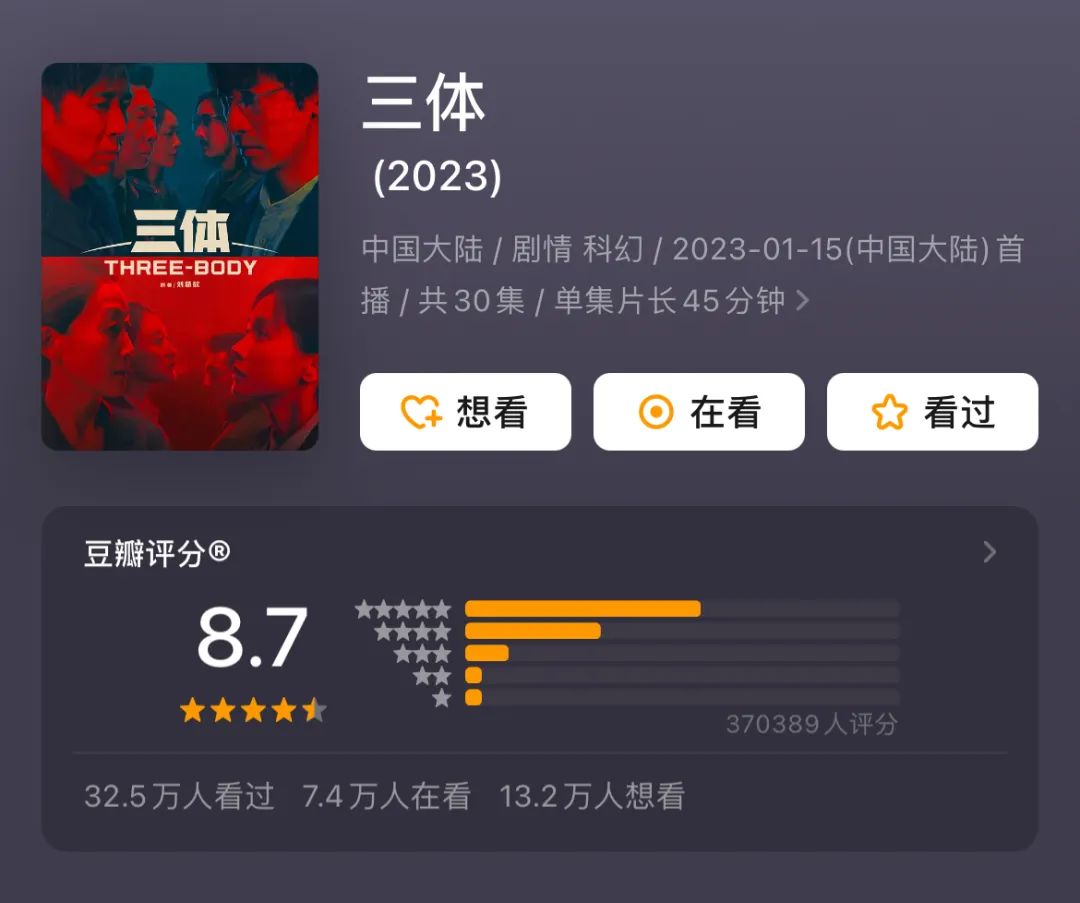 而今年年初的重量級項目《三體》在財報中僅提及了援引自豆瓣的口碑。在和《狂飆》的對比之下,《三體》的播出表現(xiàn)顯然不如預(yù)期。