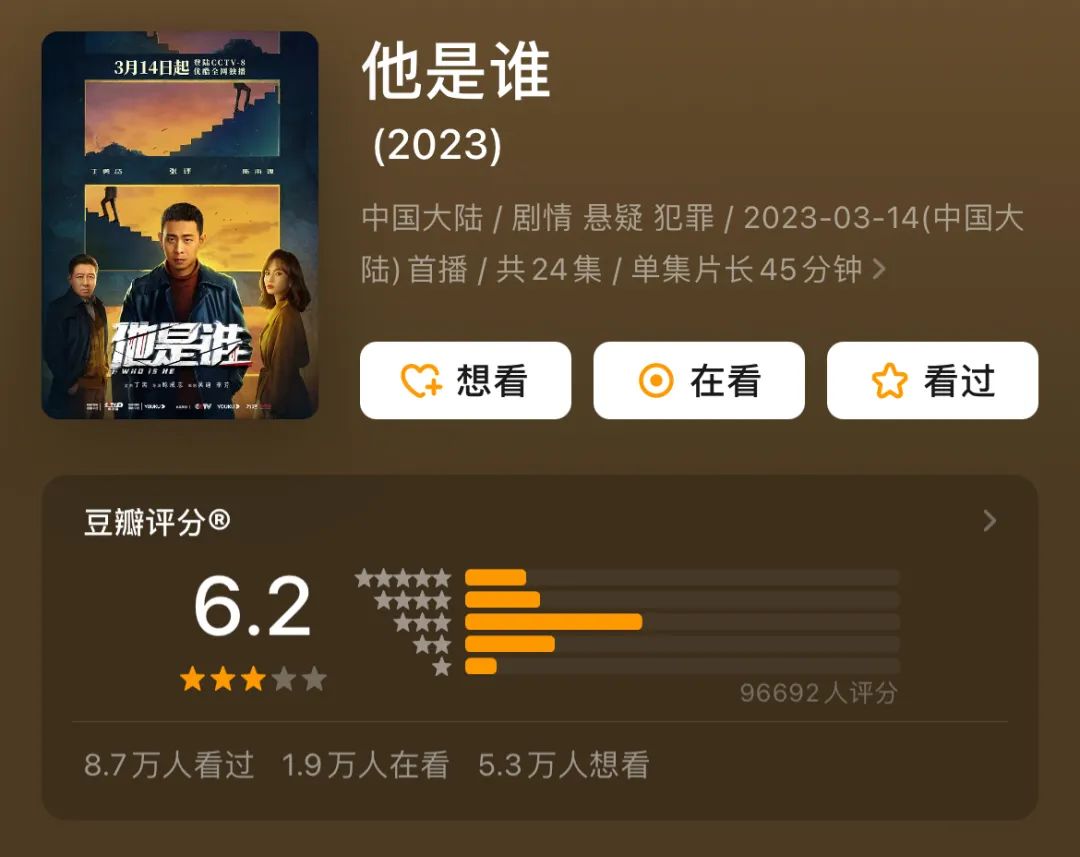 但《他是誰》后續(xù)爛尾使其高開低走,從開播時的豆瓣8.2分跌落到6.2分,令人惋惜。
