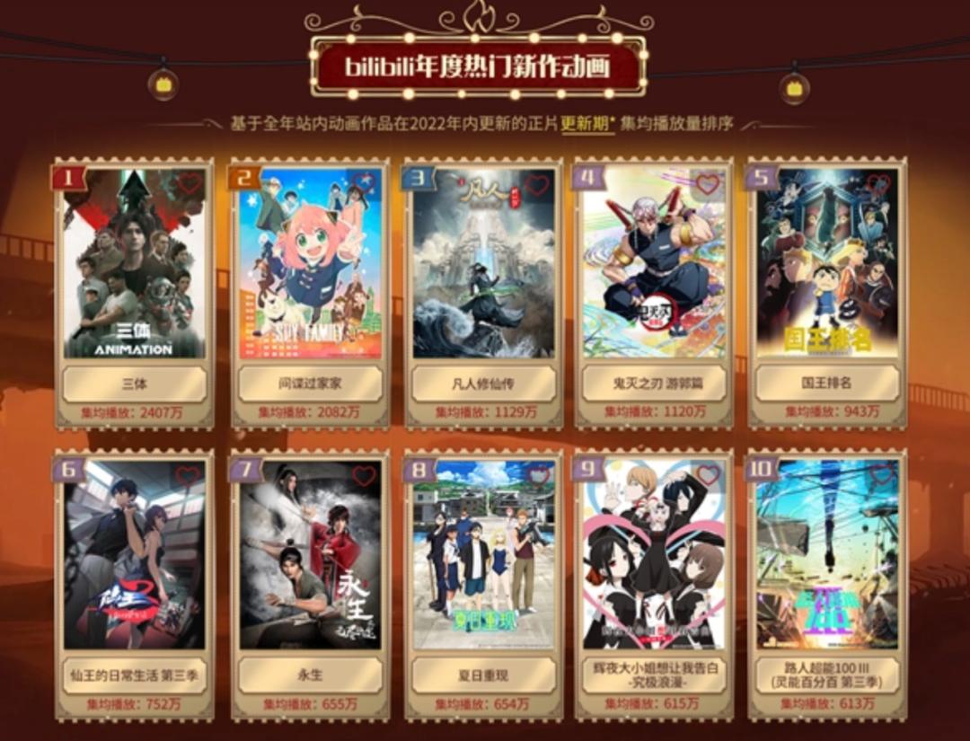 2022年B站播放量最高的視頻是動畫《三體》的第一集,奈何改編不盡人意,萬眾矚目后迅速啞火;而海外引進的《間諜過家家》則以2082萬的集均播放量成為站內(nèi)名副其實的年度口碑爆款。