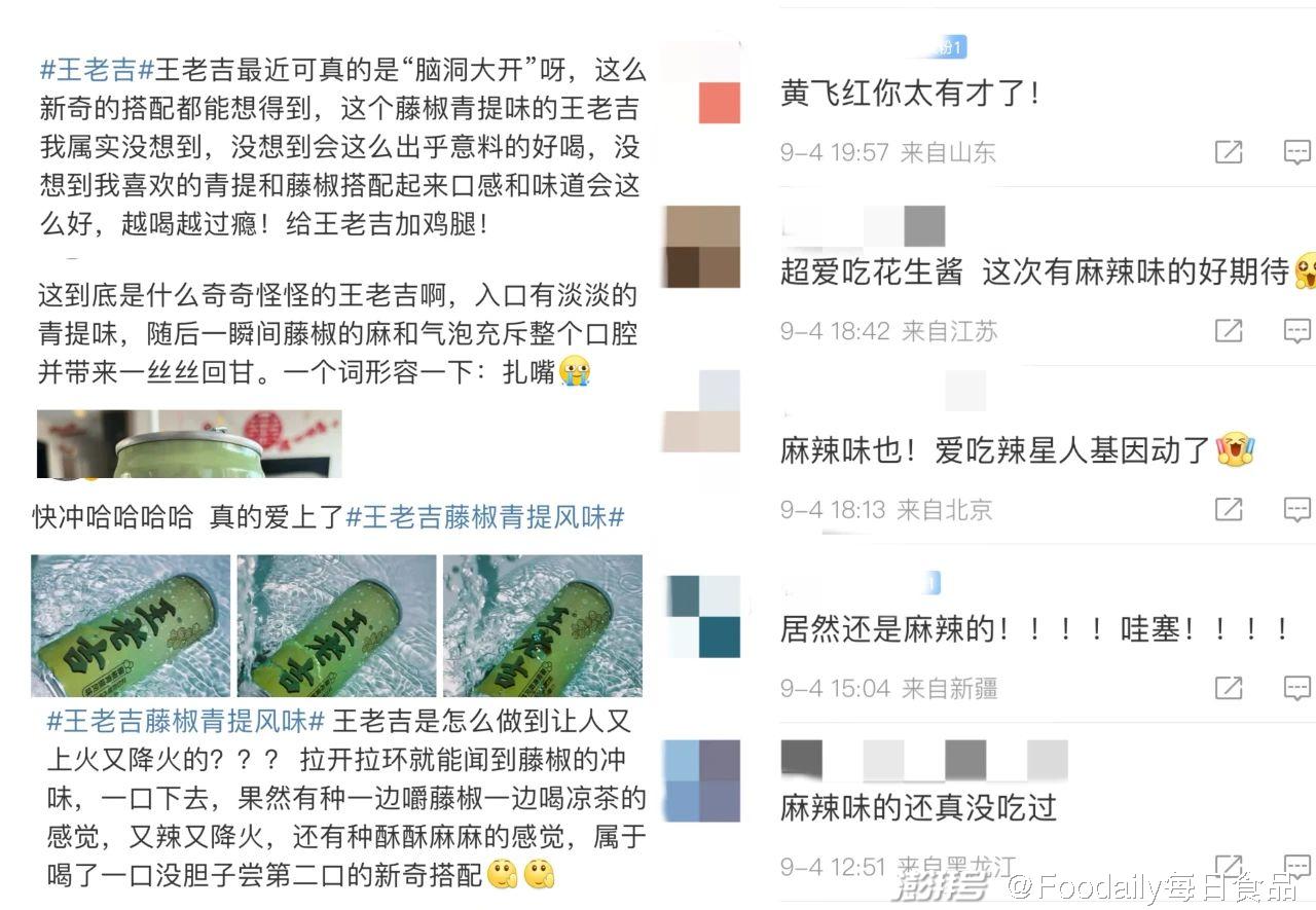這些新品引發網友們的極大興趣。大家紛紛在社媒帶話題帶卡,評價褒貶不一,有網友稱王老吉藤椒青提涼茶“扎嘴”,但也有網友稱“越喝越過癮”。