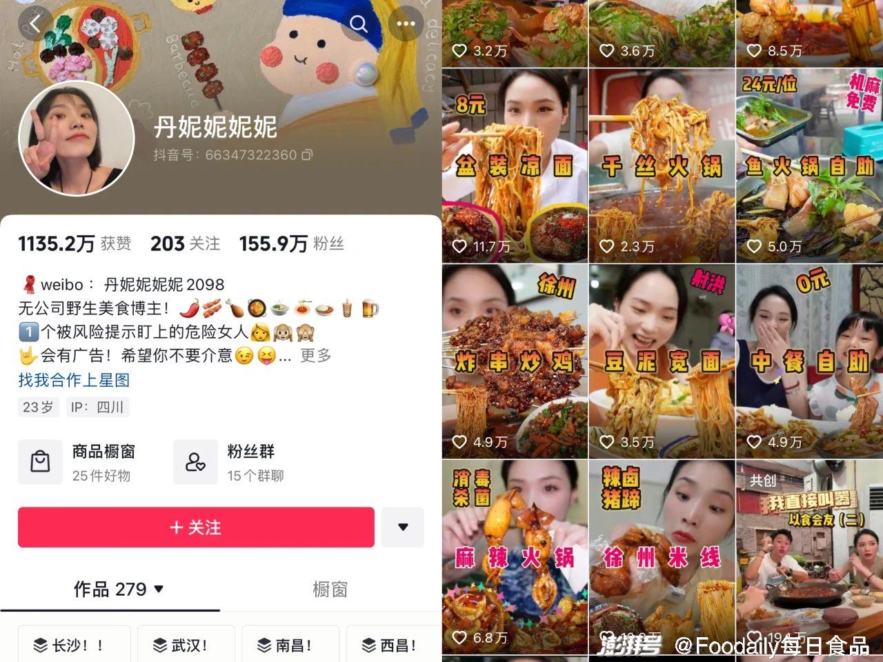 以成都吃辣博主“丹妮妮妮妮”為例,她因在各大平臺發布自己的吃辣視頻而紅遍網絡。目前,在抖音平臺她擁有155.9萬粉絲,作品獲贊總數高達1135.2萬,每個視頻的點贊數常常在幾萬到二十幾萬之間。