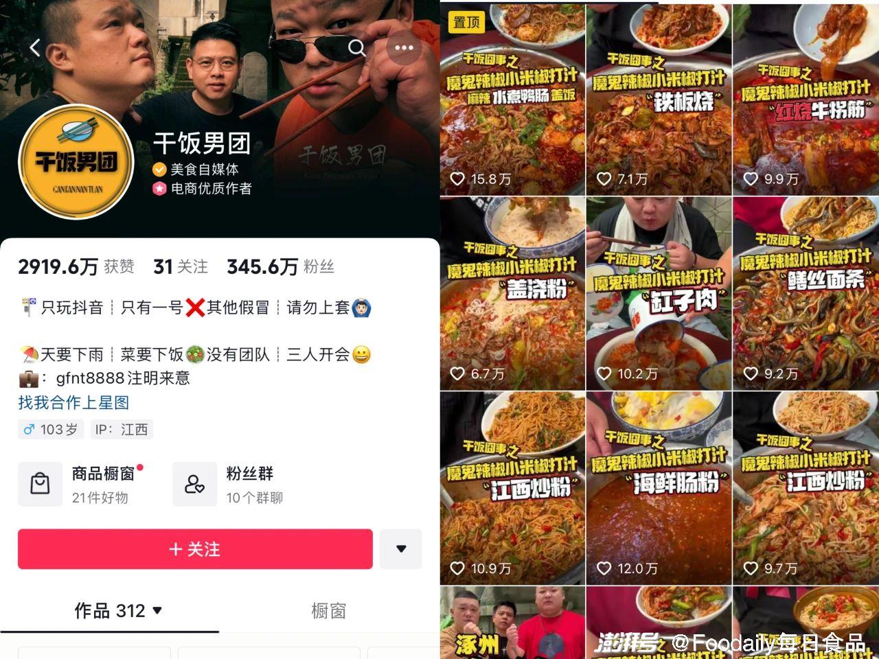 不僅是博主,一些熱衷吃辣的網友也因志同道合而“成團出道”。著名的吃辣天團“干飯男團”因挑戰各種魔鬼辣版本的食物而在抖音上爆紅,如今他們擁有345.6萬粉絲,作品總點贊數達到2919.6萬。