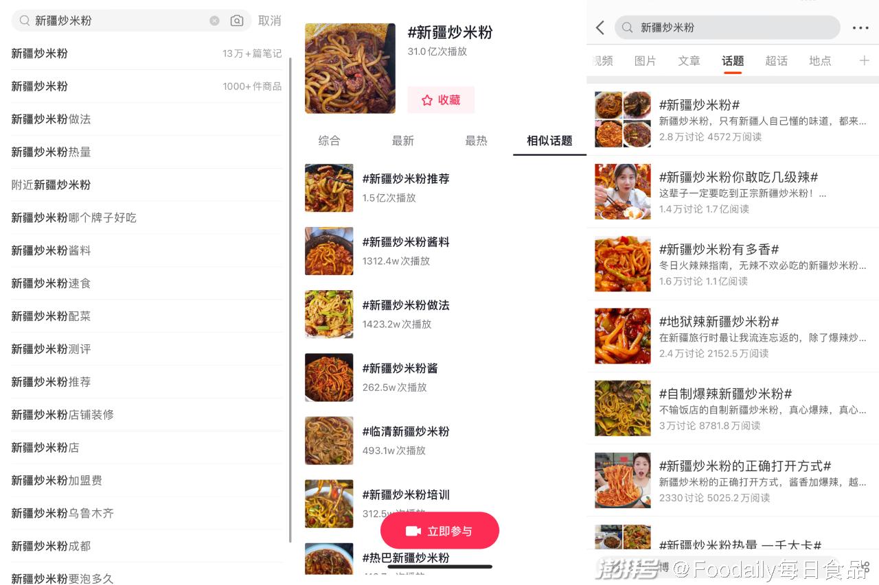 新疆炒米粉,因其爆辣特性,自去年以來在各大社交媒體平臺上引發巨大的關注熱潮。截至目前,新疆炒米粉在小紅書平臺已經積累了13萬+篇筆記,相關微博話題討論達到2.8萬次,閱讀量達4572萬次,抖音上的播放量更是高達31億次。