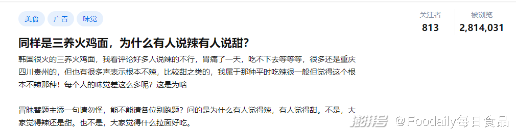 火雞面的上癮感同樣得益于其獨特的醬料。有網友在知乎上提問“同樣是三養火雞面,為什么有人說辣有人說甜”,這一問題超過了281萬的瀏覽量。實際上,這種甜辣交織的口味代表了品牌在口感創新上的精進,而并非盲目地追求“爆辣”。