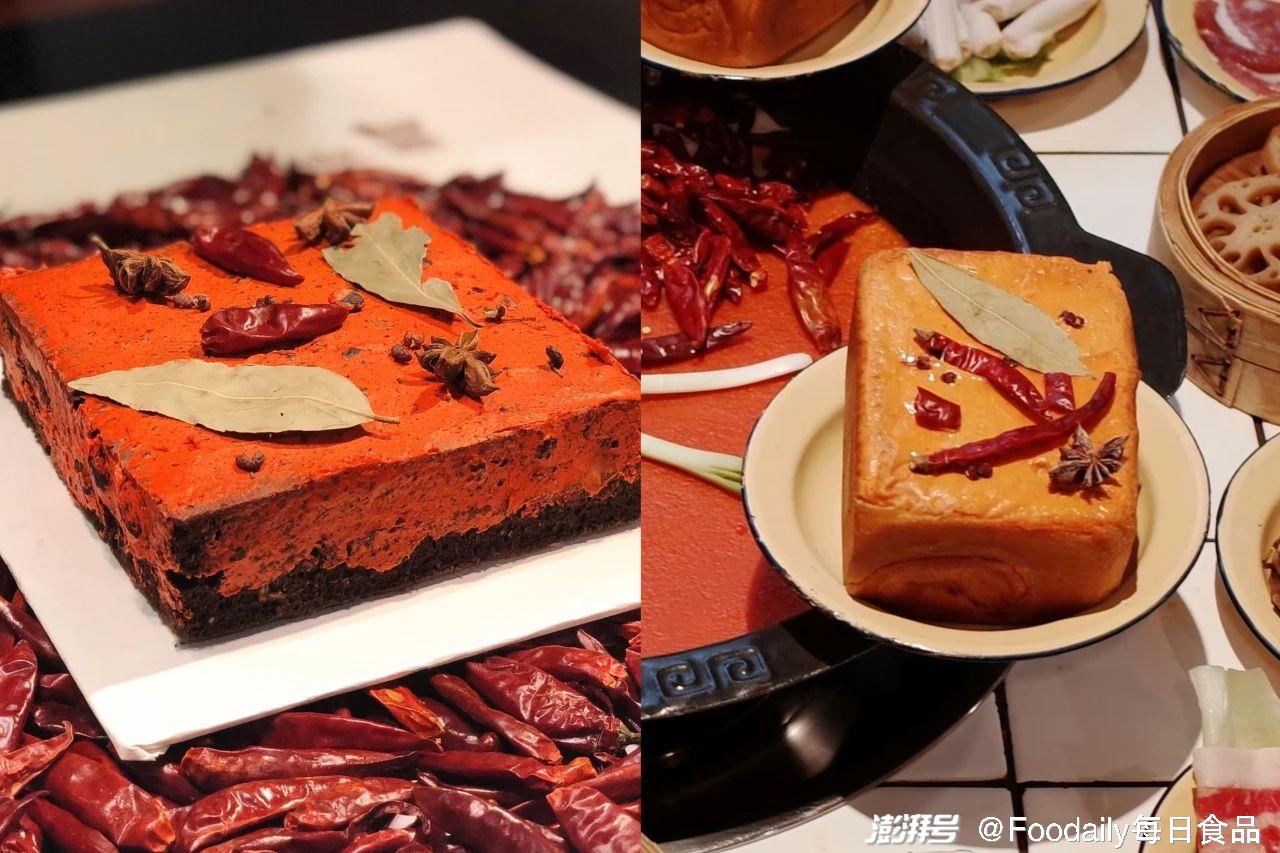 但火鍋底料蛋糕的創新遠不止于此。不久之后,奈雪的茶聯手鹵校長老火鍋推出了火鍋底料面包,面包體質柔軟,表皮倒上微辣奶酪,搭配內餡火鍋味的香腸,最后在表皮撒上八角、香葉、干辣椒、花椒點綴。