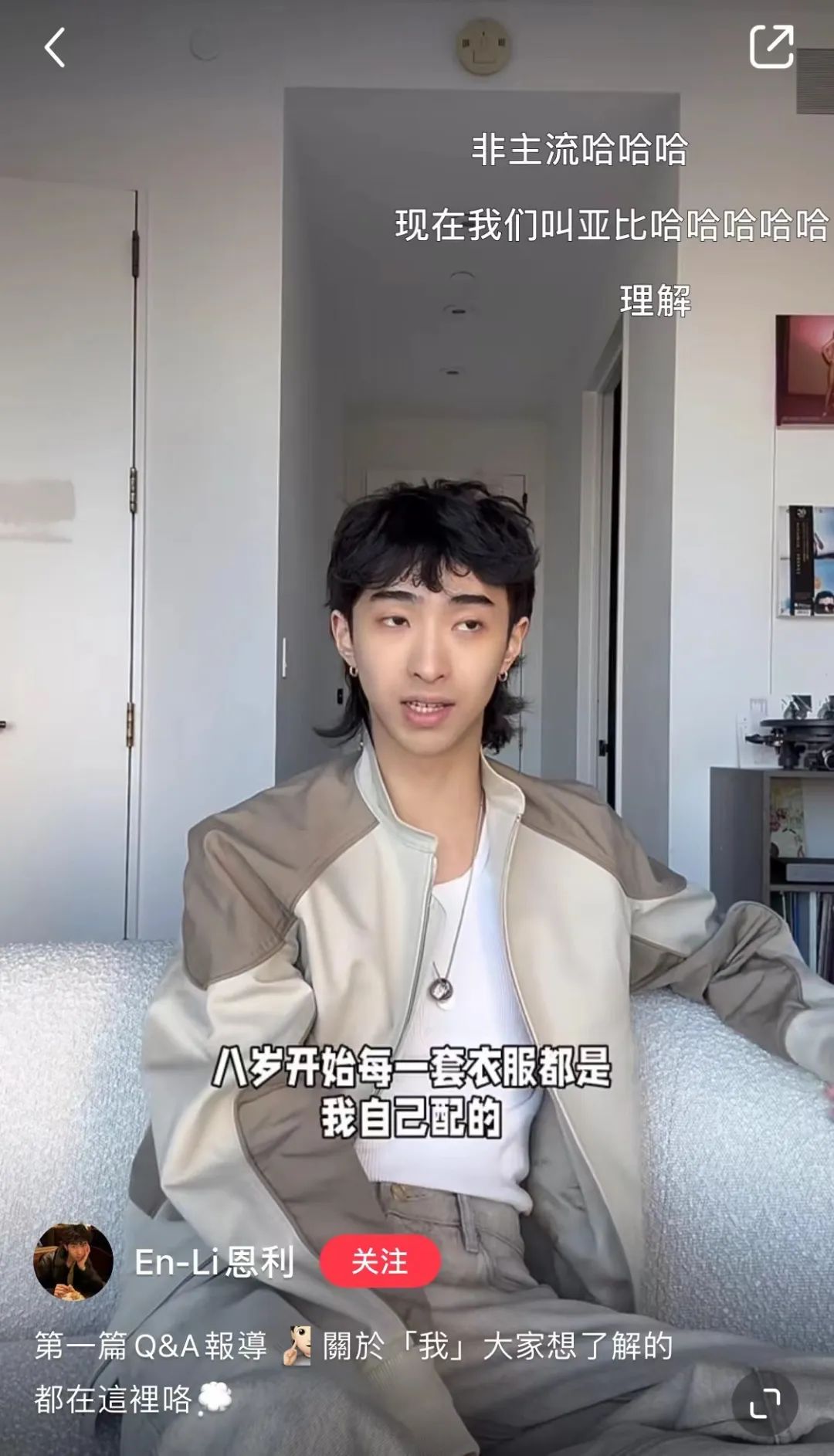 不過,最好的安利還是來自本人的發聲。恩利在社交平臺上開了自己的賬號,發出一個Q&A視頻,對于很多大家感興趣的問題都進行了回應。面對外界對于女裝的質疑,他對于著裝自由的發聲讓網友嘆服:“有些人連衣服都穿不了。既然你幸運到可以穿衣服的話,那為什么不去享受時裝的美妙呢?為什么還要立這么多規則?這段話希望可以讓審美和大眾比較不太一樣的小孩,接觸到他們藝術的靈魂,我覺得這是我最想做的事。”