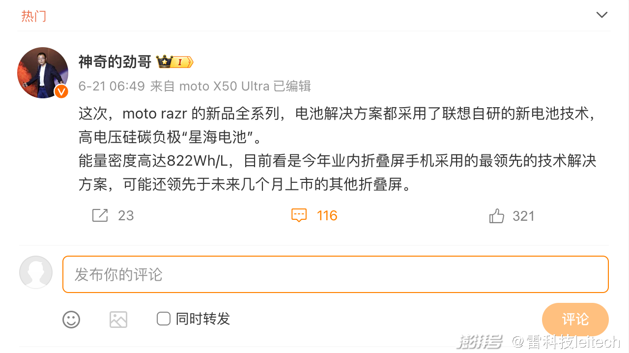 - 聯想中國區手機業務部總經理陳勁透露,全新 moto razr 系列將搭載自研高電壓硅碳負極「星海電池」,能量密度高達 822Wh/L