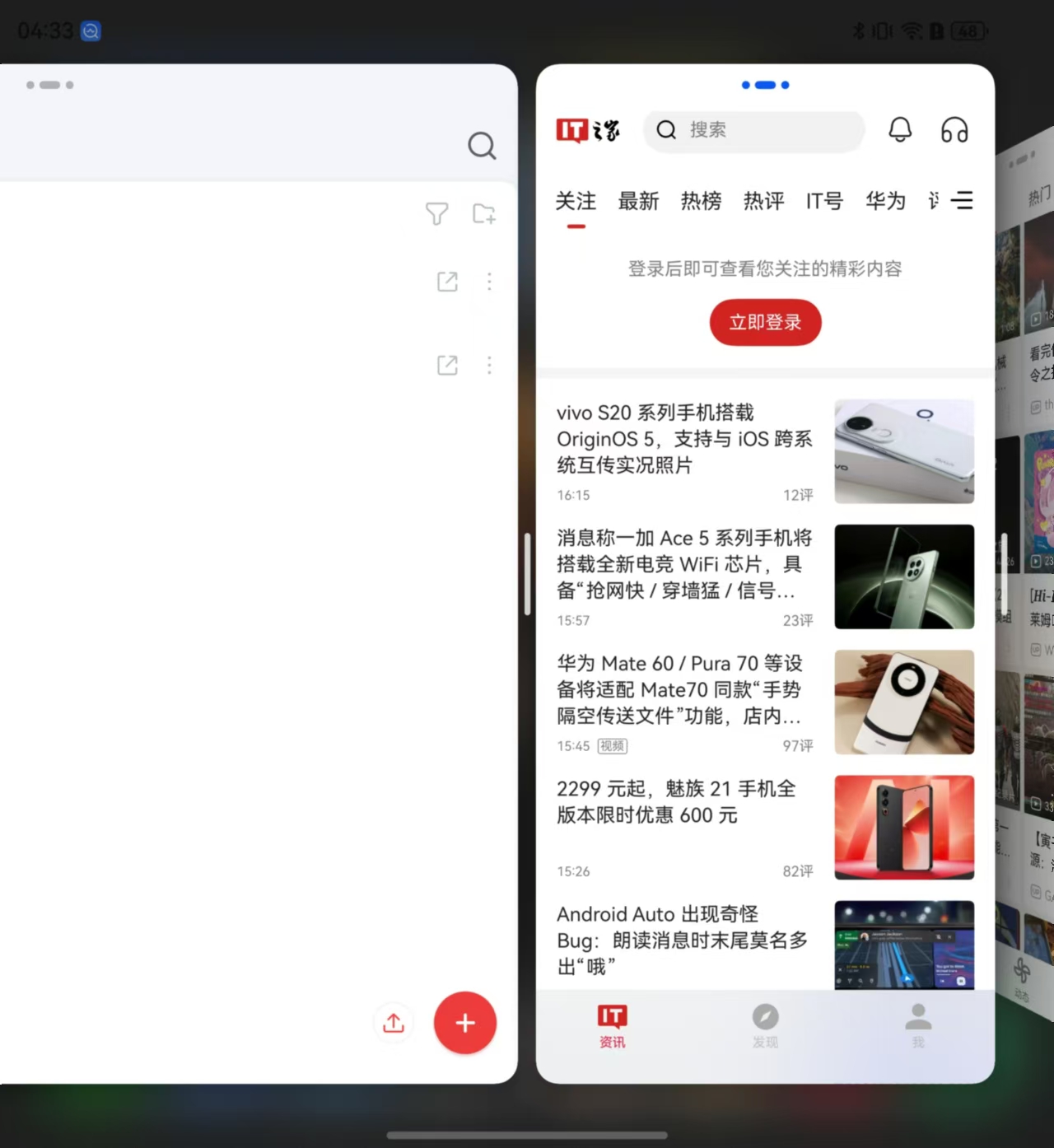 不同于「分屏+小窗」的形式,現在每個應用在前臺的時候都可接近全屏展示效果,而另外兩個應用仍處于運行狀態,通過滑動即可在三個應用間進行快速切換,體驗上和臺前調度的思路有些類似,算是個不錯的多任務處理解決辦法。
