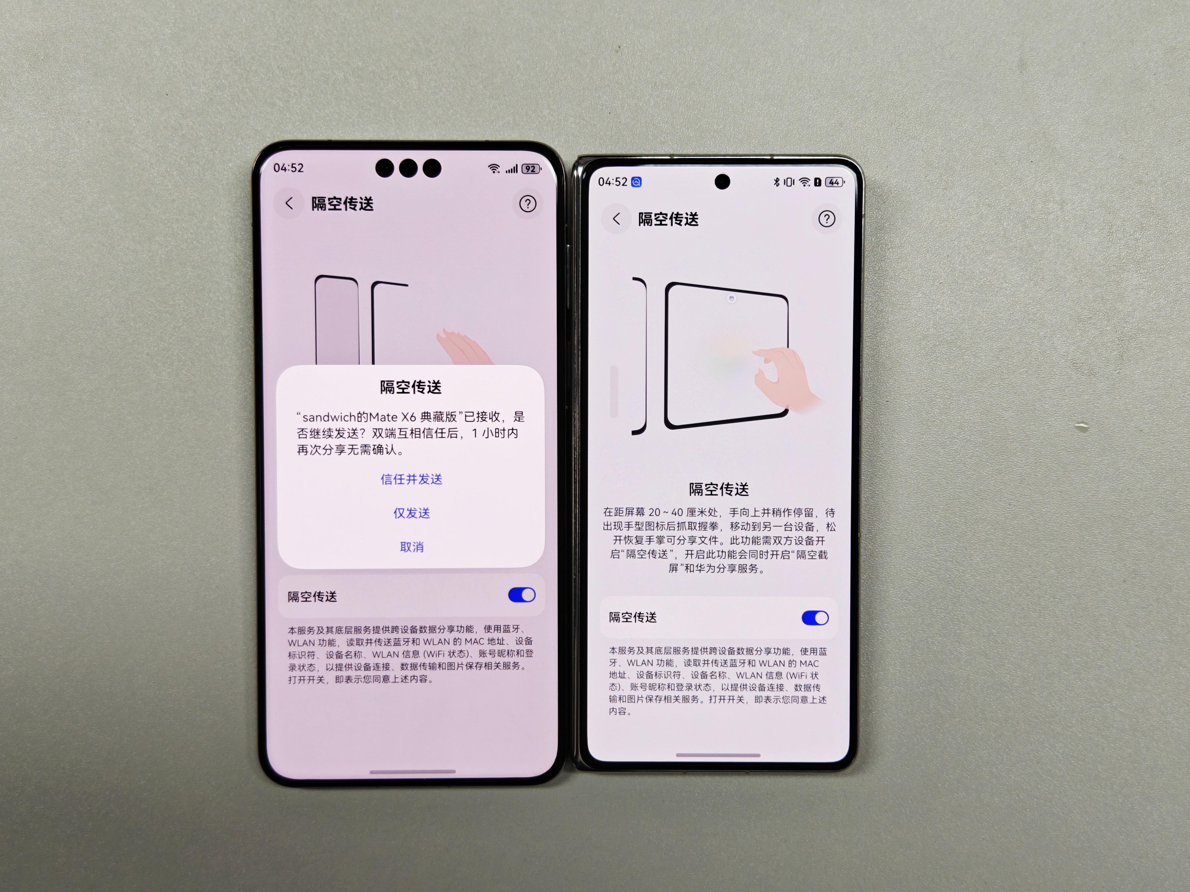 在體驗上,這次Mate X6還有個好玩的功能,那就是全新的隔空手勢,就這樣一抓、一放,就能實現文件隔空秒傳,非常實用。
