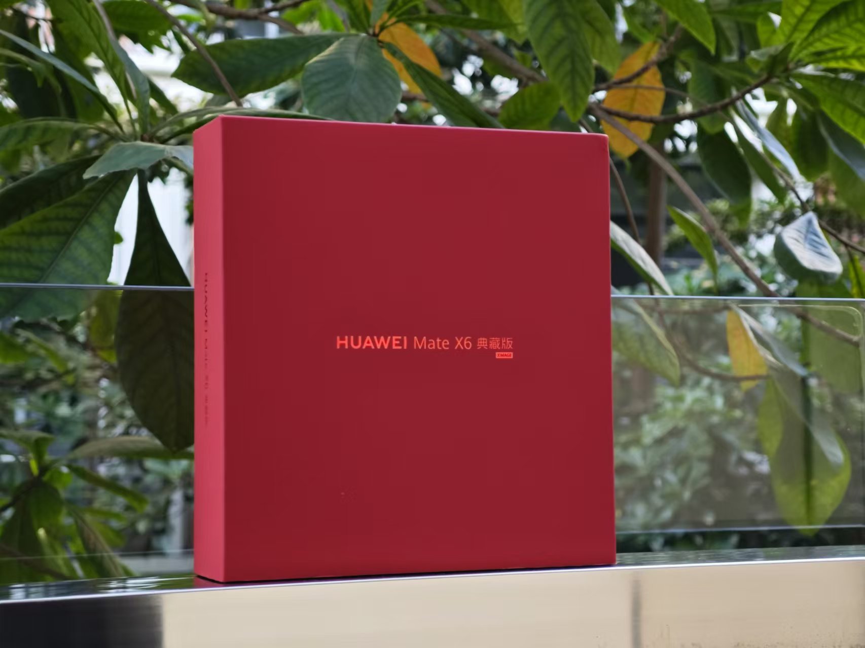 整個這個盒子呢,和之前一樣,Mate X6典藏版的外包裝采用了大紅色+黑色的經典華為配色,標志性的大紅色給人以熱情、活力的視覺沖擊,而黑色的加入則為整體設計增添了一份優雅與商務氣息。