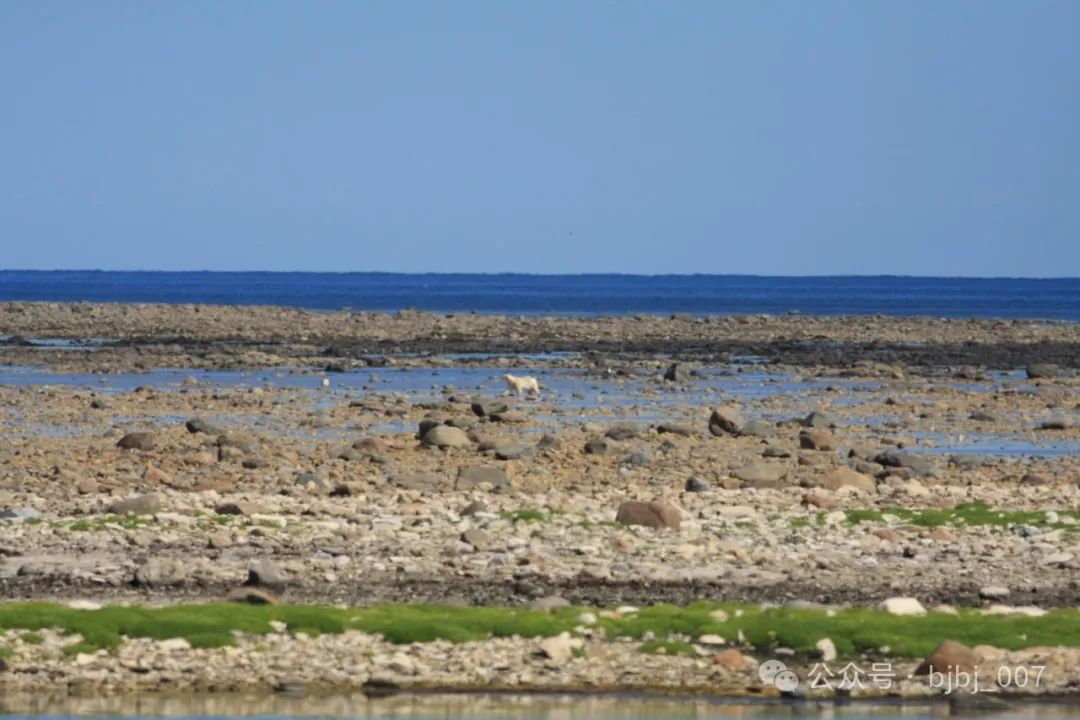 13點07分。又一只北極熊在西北側海灘的亂石和海水中急速行走,距離500米外。