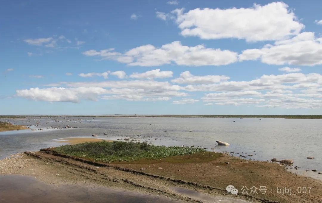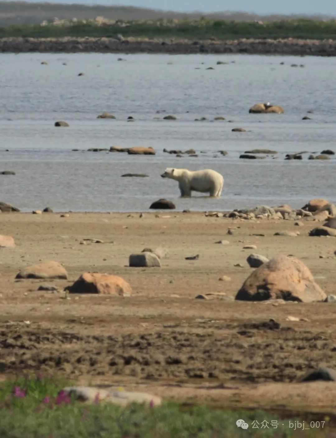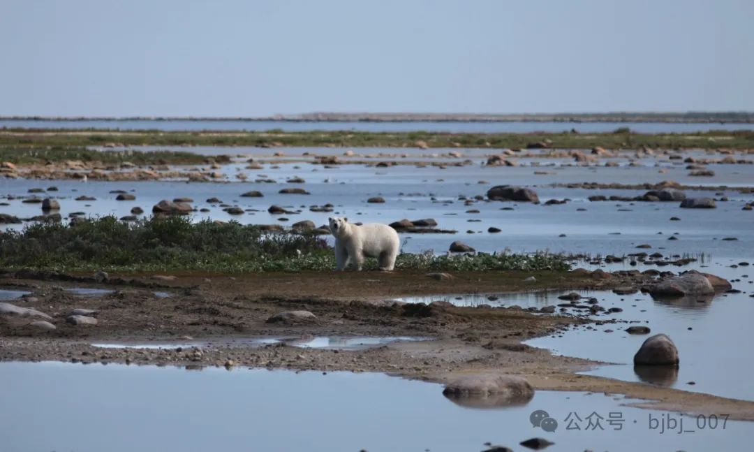 前方大約200米的地方,一只北極熊站立在草灘上。它的背后是大片的沼澤湖泊。