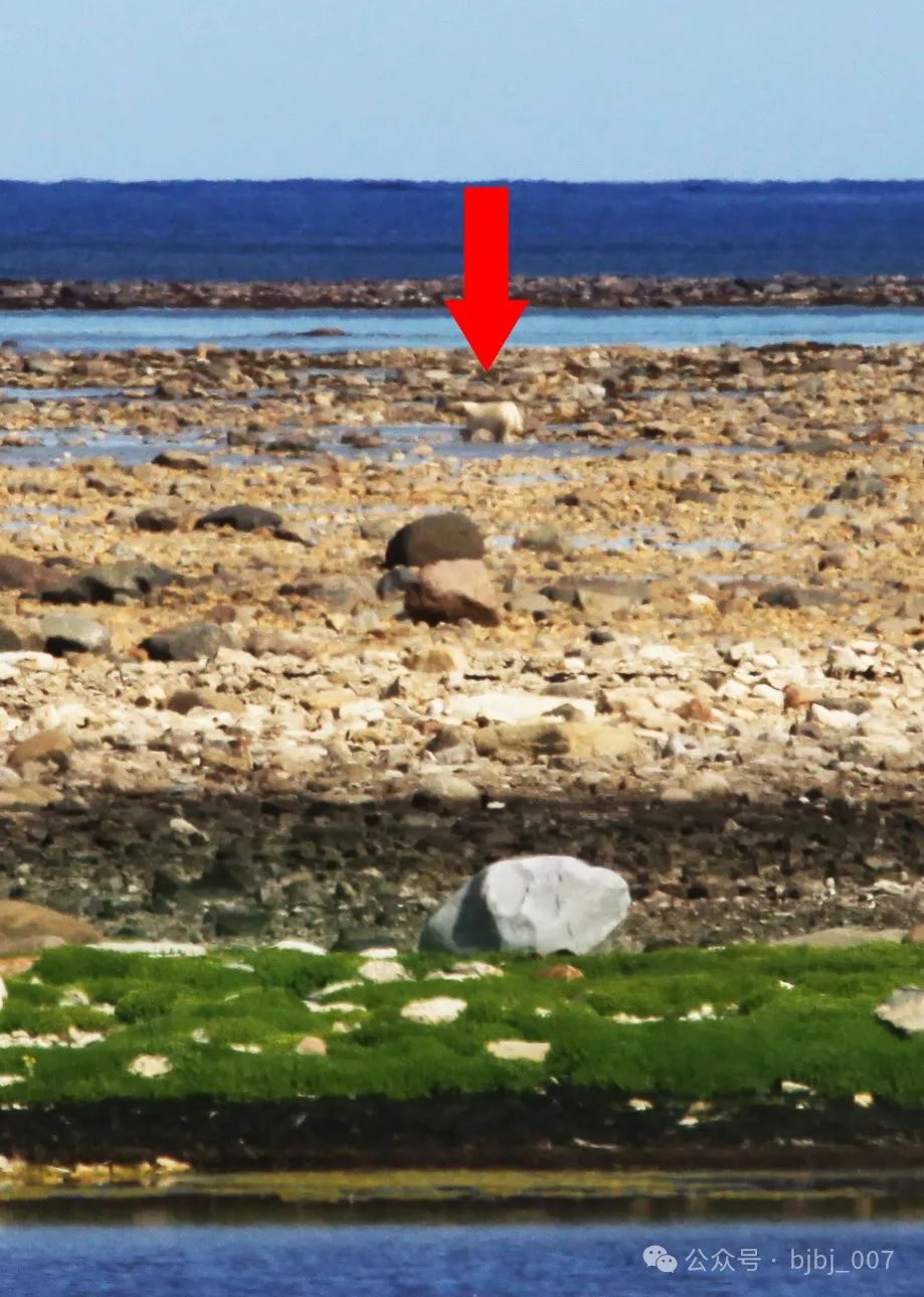 12點41分。東北方向長長的海岬邊,一只北極熊泡在海水里。距離大約在一公里開外,用400mm鏡頭拍攝,全像素放大后只有米粒大小。
