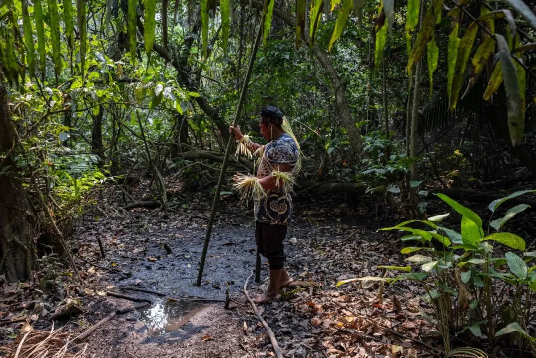 我們一行人再次登上金屬小舟,航行了10分鐘來到格雷戈里奧河的對岸。我們走進森林,來到一片長滿莫里奇棕櫚樹(buriti)的泥濘區域。塔尼從一棵樹上砍下一根七米長的樹枝,然后將其插入松軟的地面,直到它完全沒入土中。