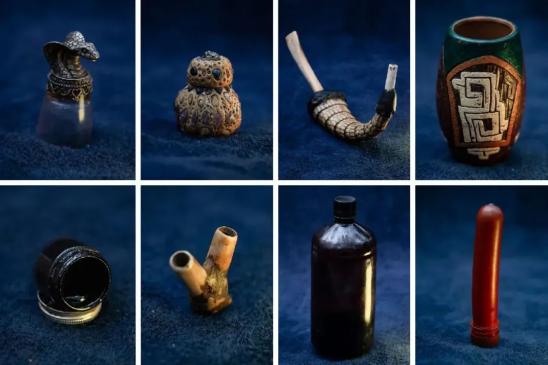 ▲上排從左向右:薩滿用來喝死藤水的杯子;用來存放藥草和煙草的鼻煙壺;tepi,用犰狳尾巴制成的用來吹鼻煙的煙斗;xumu,用來盛放草藥的神圣陶罐。下排從左向右:一罐死藤水濃縮凝膠;kuripe,一種用天竺鼠肋骨制成的用來吹鼻煙的器具;一個裝著死藤水飲品的瓶子;一罐用來為身體涂彩的胭脂木。圖片來源:Victor Moriyama / 對話地球