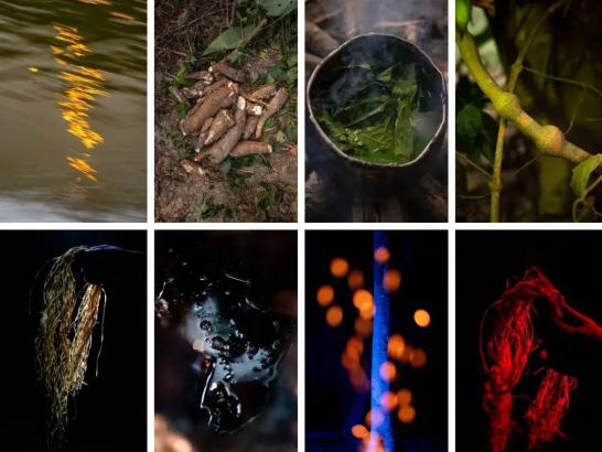 ▲上排從左到右:光影斑駁的格雷戈里奧河;木薯,用來熬制一種凈化靈魂的名為“kaissuma”的粥食;希納用來洗浴的藥草;oni(死藤水)的藤蔓。下排從左到右:用來保護和召喚神蛇“vin? ron?”的布里奇草(buriti,又稱莫里奇棕櫚樹);用作藥油的柯拜巴汁(copaiba sap);點點篝火;更多的布里奇草。圖片來源:Victor Moriyama / 對話地球
