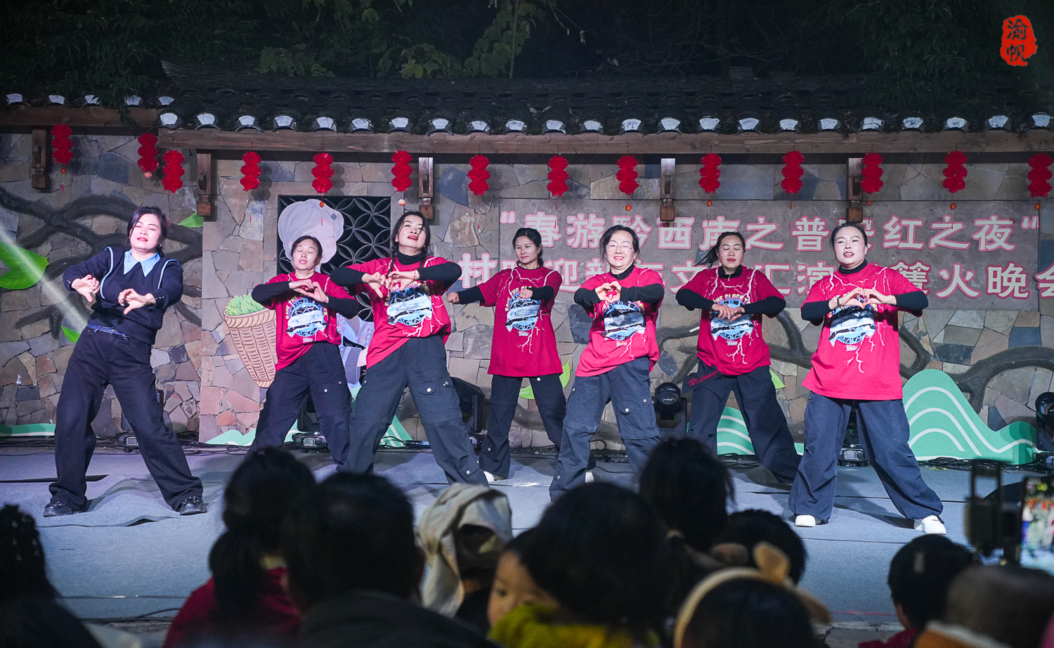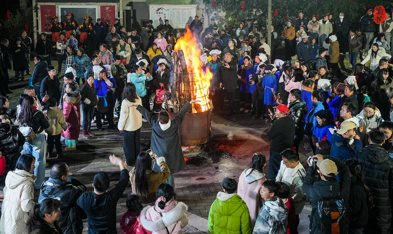 村晚的熱潮尚未褪去,篝火晚會又將氣氛推向新的高潮。熊熊燃燒的篝火照亮了細寨的夜空,也點燃了每個人的熱情。大家手拉手,圍繞著篝火跳起了歡快的舞蹈,火光映照著每一張笑臉,那份純粹的快樂仿佛能傳染給每一個人,陌生與拘謹在這一刻消散。火焰映照著一張張笑臉,歡笑聲、呼喊聲交織,寒冷被驅趕,溫暖與歡樂在人群中流淌。