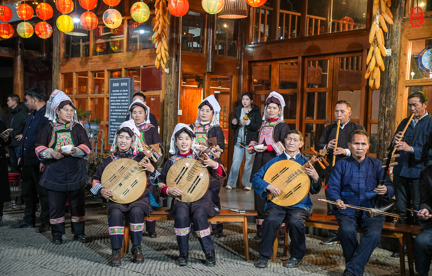 飯后不久,細寨的迎春晚會又開始了。舞臺簡易卻擋不住村民們的熱情。身著布依族盛裝的男女老少紛紛登場,傳統的布依八音演奏,那獨特的韻律仿佛帶著遠古的呼喚;村民們歌聲悠揚,舞步輕盈,傳統與現代在這里交融,古老的歌謠與現代的舞步交織,展現出細寨文化的多樣性和活力。臺下,掌聲雷動,如我一般的觀眾們沉浸在這歡慶佳節的氛圍里,每個人的臉上都寫滿了喜悅。