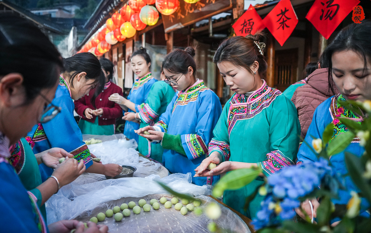 元旦其實并不是布依族的傳統佳節,但沒想到細寨的跨年活動卻熱鬧非凡,吸引了周邊村寨眾多村民,以及像渝帆這樣的外地游客,天還沒黑,全村男男女女都忙碌了起來,有的在準備長桌宴,有的在搓湯圓,有的在準備篝火晚會……
