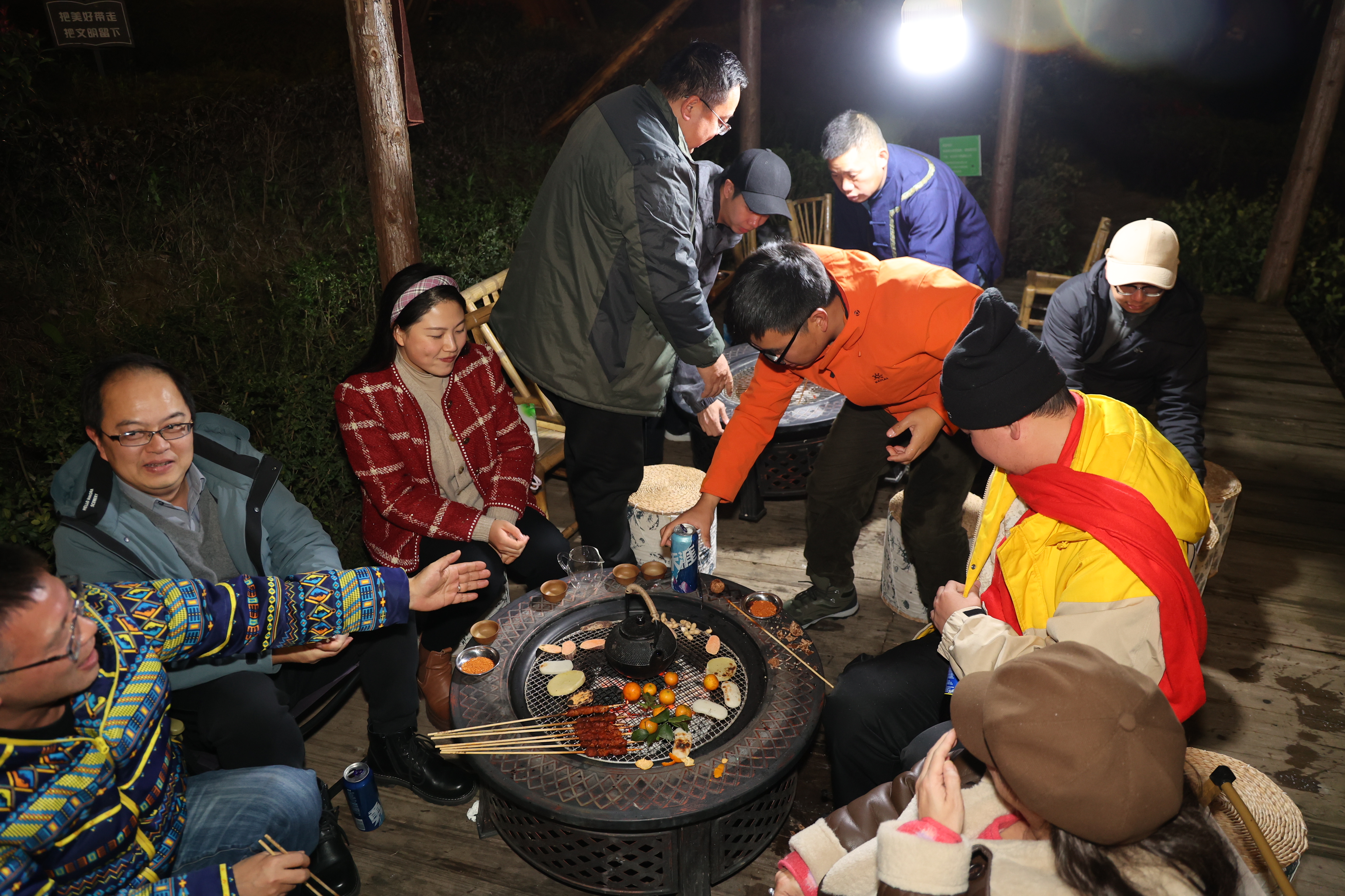 篝火晚會后,此時距離凌晨還有些時間,我們 “冬游陽光黔西南” 采風團的朋友又相聚一起,大家圍坐在火爐旁,一邊燒烤著各種美食,一邊煮著普安本地的紅茶。茶香與肉香交織在一起,令人陶醉。大家聊著天,分享著旅途中的趣事,靜待新年的到來。