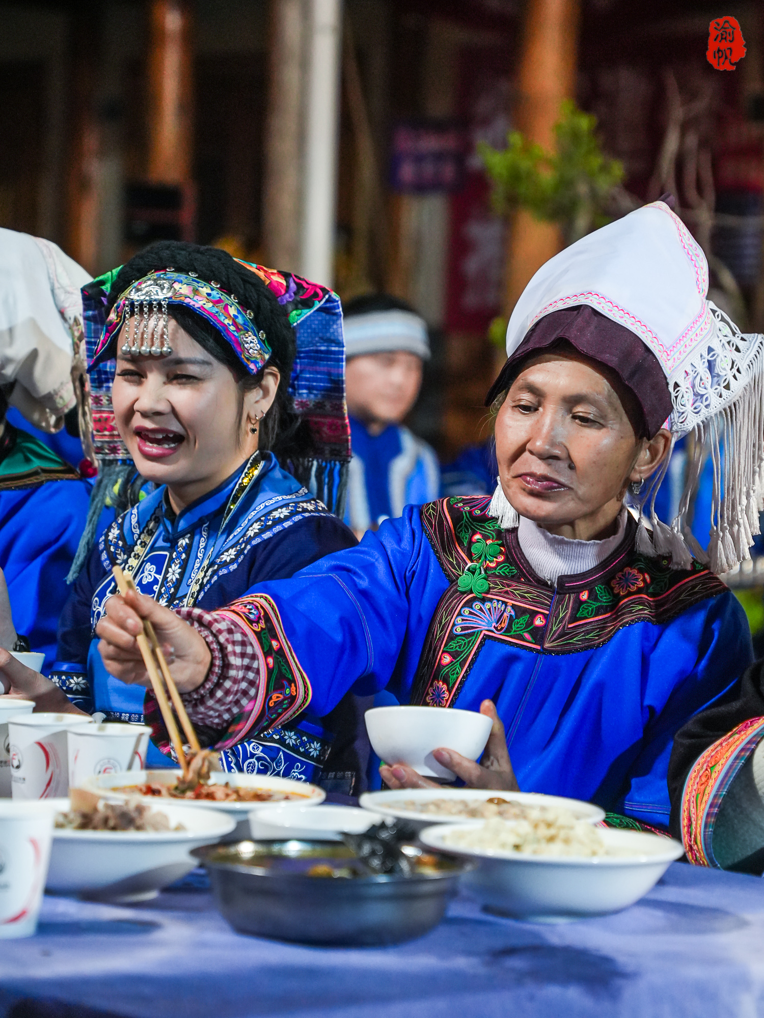 夜幕降臨,細寨的長桌宴正式拉開序幕。這是一場十分隆重的盛宴,長長的桌子從村頭一直擺到村尾,桌上擺滿了各式各樣的美食,從地道的布依酸湯魚到香氣四溢的糯米飯,每一道菜都承載著布依族人民的熱情與好客,皆是時間與煙火凝練的美味。最令人暖心的是,無論是寨里的老百姓,還是外來的游客,都能免費品嘗這豐盛的宴席。大家圍坐在一起,不分彼此,歡聲笑語在夜色中回蕩,一口熱飯,幾句家常,瞬間拉近了心與心的距離。