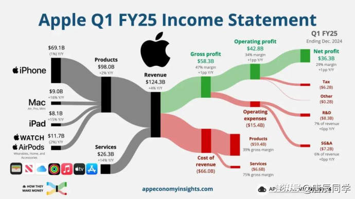 根據其最新發布的2024年第四季度財報,收入利潤雙增長。但從細分產品和市場來看,蘋果公司依然面臨著較大的壓力。