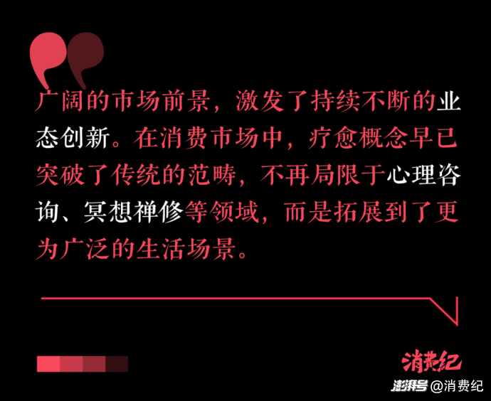 據行業調查報告顯示,當前國內療愈經濟市場規模已經達到 10 萬億元。而廣闊的市場前景,激發了持續不斷的業態創新。在消費市場中,療愈概念早已突破了傳統的范疇,不再局限于心理咨詢、冥想禪修等領域,而是拓展到了更為廣泛的生活場景。