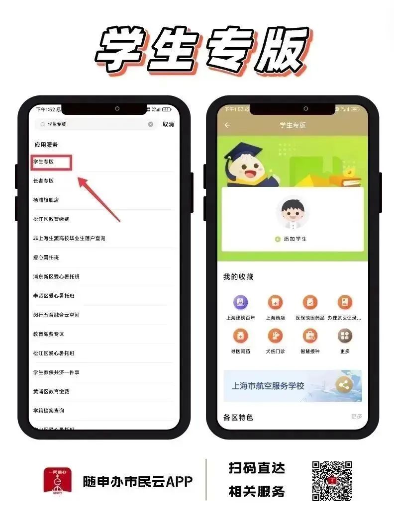 凡本市在籍學生或學生家長,皆可通過“隨申辦市民云”APP“學生專版”服務,了解學校動態、招生考試、查詢學籍檔案、學區查詢等