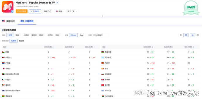 DataEye研究院注意到,近期麥芽旗下海外短劇應(yīng)用NetShort勢頭正盛,不僅連續(xù)3周蟬聯(lián)DataEye海外微短劇APP素材投放榜首,還在全球多個(gè)國家/地區(qū)登上App Store免費(fèi)/娛樂榜榜首。