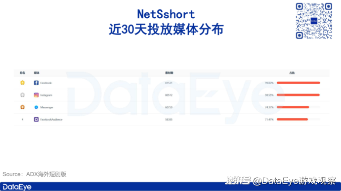 ADX海外短劇版數(shù)據(jù)顯示,近30天NetShort投放媒體為Facebook、Instagram、Messenger及Facebookaudience,其中,后兩家媒體素材量相對偏低。