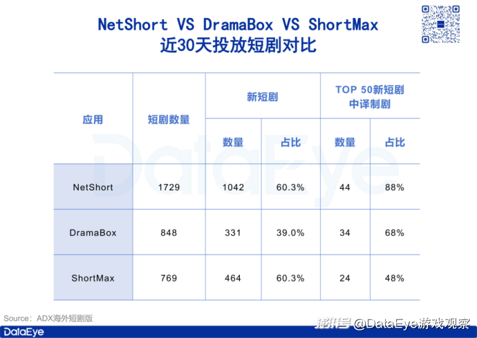 ADX海外短劇版數(shù)據(jù)顯示,近30天,在投放短劇數(shù)量上,三款應(yīng)用排名與投放素材量排名一致,NetShort>DramaBox>ShortMax;不過在新短劇占比上,NetShort與ShortMax均為60.3%,明顯高于DramaBox的39.0%。