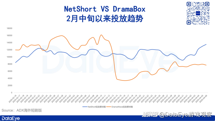 ADX海外短劇版數(shù)據(jù)顯示,NetShort登頂買量榜前幾周,DramaWave日投放素材量普遍維持在1.4萬組左右,同期NetShort近維持在1萬組左右,差距明顯。