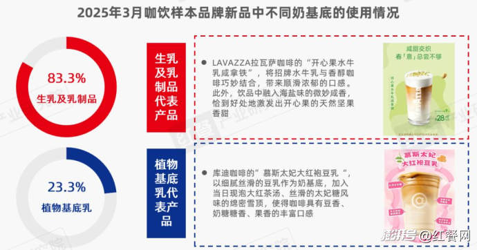 2025年3月的咖啡類新品中,奶基底趨向生乳及乳制品,植物基底乳風味升級。咖飲品牌在新品中使用的奶基底主要分為生乳及乳制品、植物基底乳、植脂末與脂質乳和其他四大類。紅餐產業研究院監測發現,2025年3月,在咖飲樣本品牌的含乳基底新品中,生乳及乳制品占據主導地位,占比達83.3%。其中,牛乳應用最廣泛,強調“100%動物乳脂肪,0植脂末、0植物油”等健康屬性。