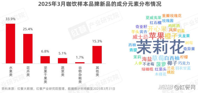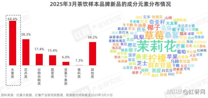 從2025年3月的新品元素來看,水果類元素依舊是茶飲新品的核心成分元素,例如草莓、椰子、鳳梨、蘋果、芭樂等。其中,一只酸奶牛推出了芭樂葡萄酸奶鮮酪、芭樂葡萄酸奶昔,7分甜推出了黑桑葚·四重莓果和黑桑葚·莓果酸奶。相較于2月,在3月的茶飲新品中,除茉莉花、草莓等通用元素外,桑葚、鳳梨、油柑等特色水果元素的應用進一步增加,體現了茶飲品牌更注重口感與營養的創新搭配。