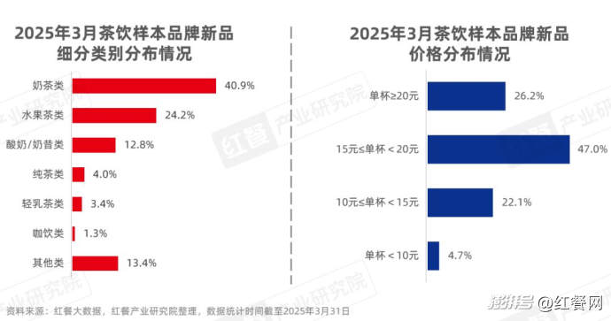 2025年3月,紅餐產業研究院監測到有55個茶飲品牌推出了149款新品。其中,奶茶類新品最多,共計61款,占當月茶飲新品數量的40.9%;水果茶類新品數量次之,為36款,占比24.2%。
