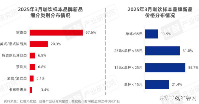 2025年3月,紅餐產業研究院監測到有18個咖飲品牌共推出了59款新品。其中,拿鐵類新品最多,共34款新品,占新品總量的57.6%;其次是美式/意式濃縮類新品,共有12款新品,占比為20.3%。