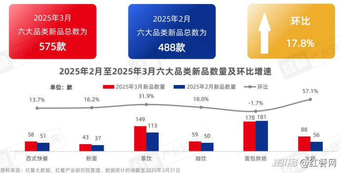 在新品數量方面,3月份的新品數量明顯回升,各品牌的產品創新力度和積極性都有了明顯的增加。2025年3月,紅餐產業研究院監測到,西式快餐、粉面、茶飲、咖飲、面包烘焙、火鍋這六個品類的新品數量總共為575款,環比上漲17.8%。