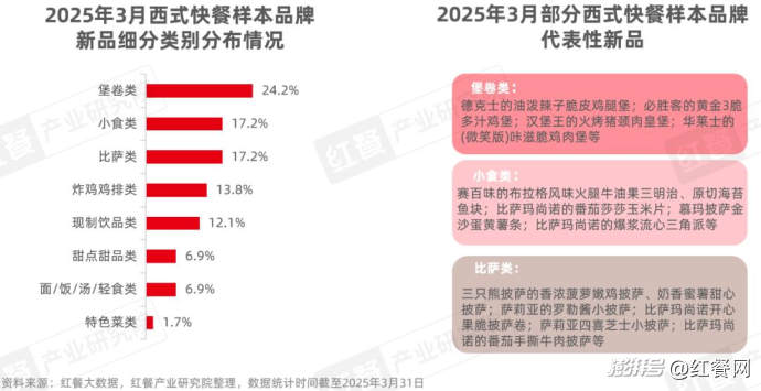 紅餐產業研究院監測發現,2025年3月有15個西式快餐品牌共推出了58款新品,環比上漲13.7%。從新品的細分類別來看,當月新品涵蓋的類別有堡卷類、小食類、比薩類、炸雞雞排類、現制飲品類、甜點甜品類、面/飯/湯/輕食類、特色菜類共8種。