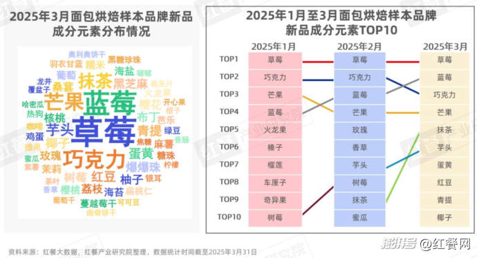 在2025年3月的面包烘焙新品中,草莓、藍莓、巧克力、芒果等食材元素的使用率最高,并在近3月內穩居前列。而抹茶、芋頭、紅豆等中式元素入圍TOP10。