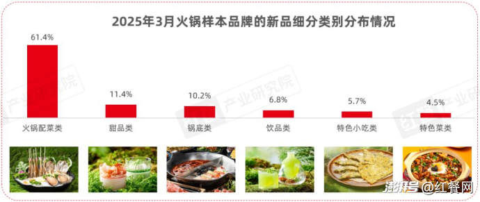 2025年3月,在紅餐產業研究院監測的火鍋品牌中,有22個火鍋品牌共推出了88款新品。從新品的細分類別來看,當月火鍋新品涵蓋的類別有火鍋配菜類、甜品類、飲品類、鍋底類、特色小吃類和特色菜類。