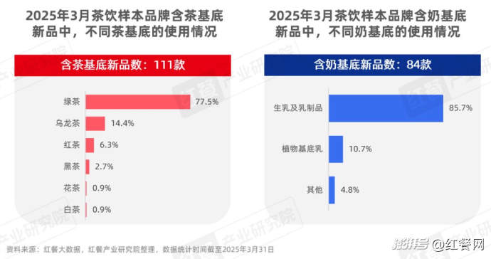 從新品的茶基底來看,2025年3月含茶基底的新品共有111款。其中,綠茶以77.5%的占比成為主流成分,例如,茉莉綠茶、龍井茶(如浙江龍井、越州龍井)、碧螺春、抹茶(如貴州抹茶、徑山抹茶等)等知名綠茶品種高頻出現,受茶飲品牌青睞。